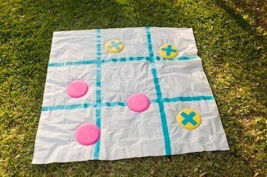 Duct tape (or chalk) and frisbees are all you need. Then follow the beloved game of tic tac toe. (If you don't have many frisbees, you can use one to throw and use another object to distinguish whose boxes are whose).
