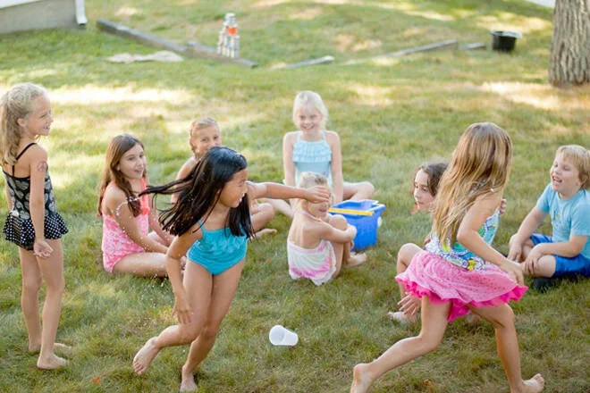 Do you know how to play Duck duck goose? If you do, then you know how to play Drip drip drop! First, you gather in a circle and have one person tap heads on the outside of the circle. The TWIST is instead of just simply saying "goose" for the person who has to chase the counter, they have to dump a bucket of water on them!